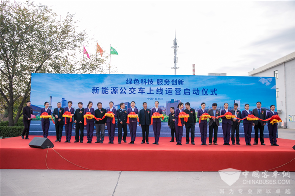 2020年11月20日上午,在石家庄公交四公司场院,以“绿色科技、服务创新”为主题,“新能源公交车上线运营启动仪式”隆重举行。河北省城市客运管理局、石家庄市交通运输局、市公安交管局、市财政局、市发改委、石家庄公交总公司等相关领导出席活动,共同为新车上线仪式剪彩。