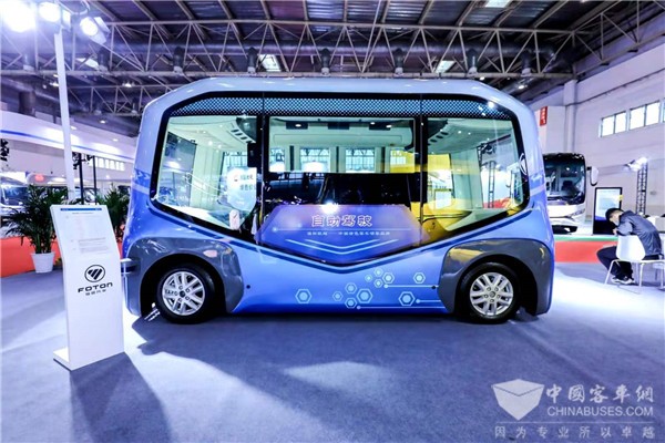 在展会现场,福田欧辉展出了针对2022年北京冬奥组委驻地——首钢工业园量身打造的MINI自动驾驶客车,车辆能够在较狭窄内部道路上自动驾驶,可实现车道保持、紧急制动、主动避障、自适应巡航、定点停车、交通标志识别。