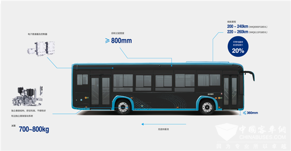 这得益于,新车采用轮边独立悬架驱动系统,车身轻量化整车减重700-800kg,乘车效率提升50%,同等座位数站立面积提升69%,电耗及能耗皆大幅降低,实现经济高效运营;车内全平地板、大通道布局,后轮过道达到800mm,实现(童车或轮椅等)无障碍快速通行;搭载金龙ECO-Chip易驱3.0新能源管理系统,为乘客带来更高效、安全、舒适的移动出行体验。