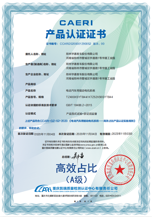 宇通客车荣获国内首张“电动汽车驱动电机系统高效占比A级认证”证书