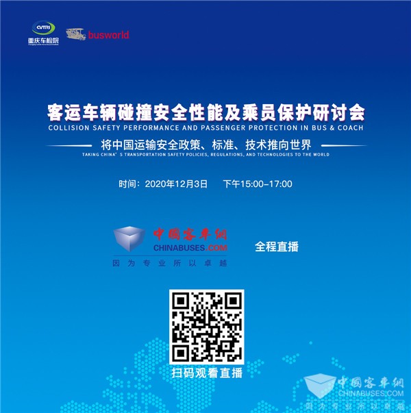 为促进客运车辆安全性能提升,由招商局检测认证(重庆)有限公司、重庆车检院、世界客车博览(Busworld )共同主办的第二期中国巴士与客车技术国际论坛,将于2020年12月3日15:00-17:00通过网络会议形式举办。