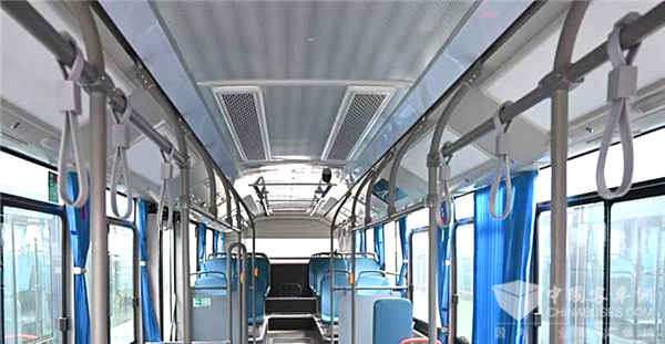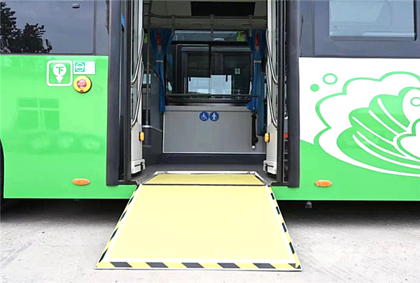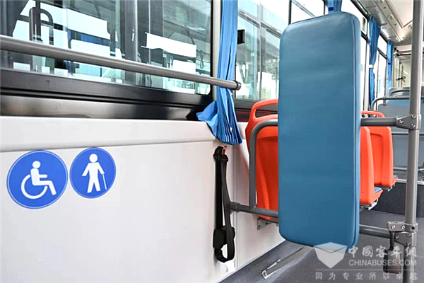 另外,车厢中部也为特殊人群的出行做了考虑。车厢中部设置了两排4个橙色的特殊乘客座位;下车门位置设置了轮椅停放区,下车门设有上下车导板,放下导板后,轮椅可以直接推进公交车。轮椅停放区装有软靠垫和安全带,方便特殊乘客倚靠和固定。