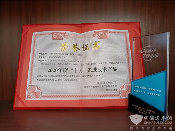 本次峰会中,国唐汽车的“L3级智能网联城市客车研发及示范应用”项目经过层层选拔,最终荣获“2020年江苏省汽车(车联网)产业重点领域十大先进技术产品”荣誉,并成功入选《江苏省重点新能源汽车企业重大创新技术和产品目录(2020)》。