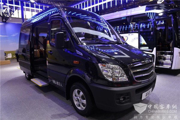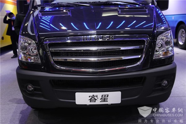 在北京车展上第一次看到海格睿星时感觉它相当惊艳,黑色的车漆让人感觉十分稳重,造型也相当前卫。中间的进气格栅采用盾牌造型,左右两边的车灯也采用了组合式设计,前脸具有欧洲轻客的风格。