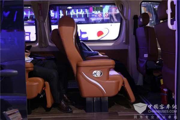 旅游出行肯定要舒舒服服的,睿星的座椅配置非常豪华,使用了全包围的商务座椅,坐在上面非常软。举个例子,高铁一等座的座位宽度是580mm,海格睿星的坐垫宽度就达到了500mm。另外座椅侧面装有扶手,前面带有脚托,完全就是一等座的乘车体验。