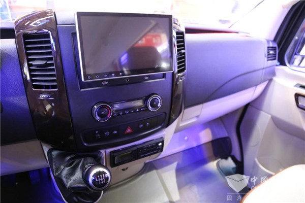 中控台上还安装了一块尺寸非常大的液晶触控显示屏。中控台的显示屏应该可以和车舱内前顶部的显示屏同步,同事们坐在一起讨论着看电影或电视剧的感受应该也非常不错。
