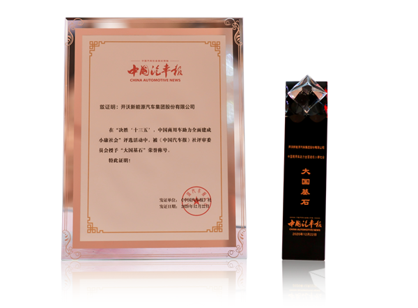2020年12月22日,由中国汽车报社主办的首届“车轮上的中国——商用车助力全面建成小康社会”年度盛典在北京隆重举行。经评审委员会评选,开沃汽车荣膺“大国基石”荣誉称号;同时,被一致认为零排放零污染的开沃纯电动自卸车表现卓越,获得“城市卫士”荣誉。这既是对开沃汽车长期坚持建设美丽中国的肯定,也是对开沃汽车助力全面建成小康社会做出巨大贡献的嘉奖。