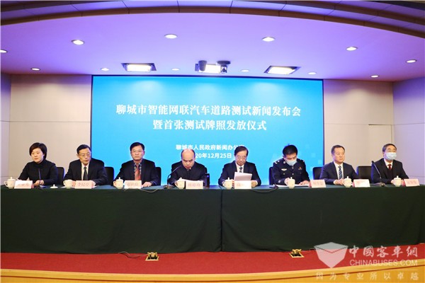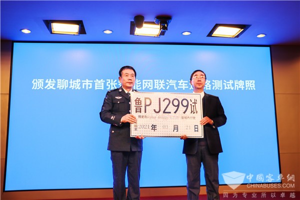 2020年12月25日,聊城市智能网联汽车道路测试新闻发布会暨首张测试牌照发放仪式在山东聊城隆重举行。中通客车正式获颁聊城市首张智能网联汽车测试牌照,全面助力聊城智慧公交体系建设。