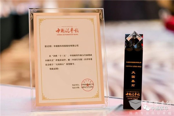 近日,由中国汽车报社主办的“车轮上的中国——商用车助力全面建成小康社会”年度盛典在北京举行。中通客车在评选中脱颖而出,荣获“大国基石”的称号,中通新世嘉荣获“高效出行专家”称号。