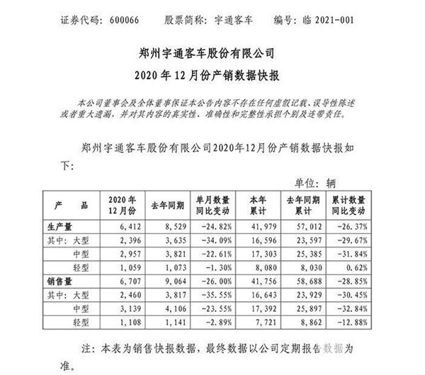 2021年1月5日,郑州宇通客车股份有限公司发布了2020年12月份产销数据快报。数据显示,2020年12月,宇通生产大、中、轻型客车6412辆,同比下降24.82%,销售各型客车6707辆,同比下降26%;2020年1-12月,宇通累计生产各型客车41979辆,同比下降26.37%,累计销售客车41756辆,同比下降28.85%。