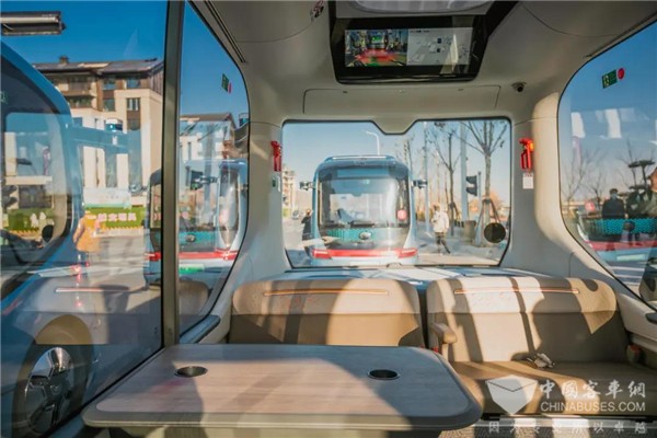 在之后的会议中,现场连线了道路试乘画面。从画面中可以看到,宇通自动驾驶微公交可以实现自动减速、自动变道、自动超车、智能躲避障碍物等,提升出行效率的同时,减少了交通事故,还能帮助乘客得到更舒适的驾乘体验。