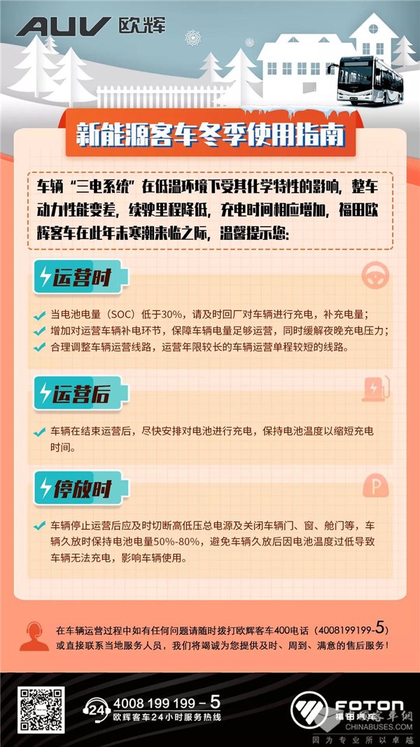 福田欧辉客车冬季防护指南为客车运营提供了全面细致的建议,并设置了各个服务点进行全程保障,为客车低温运营保驾护航。