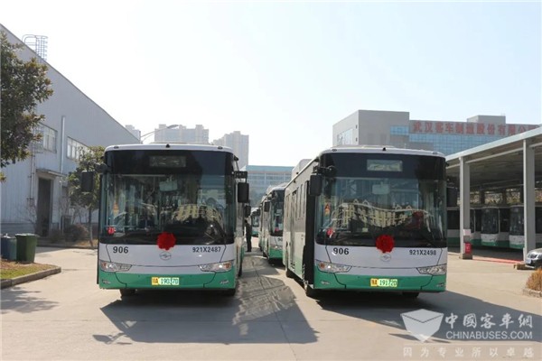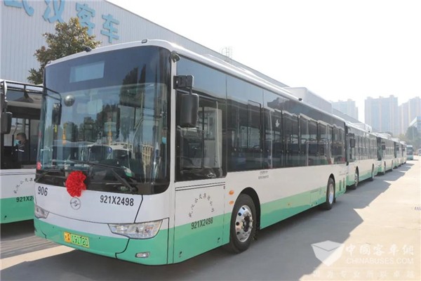 2021年12日下午,一抹抹绿白交错的身影在武汉客车总装车间厂房前依次排列,舒适的座椅、开阔的驾驶室视野、全面升级的内部设备......100台10.5米纯电动城市客车(WH6102GBEV)披红挂彩,整装待发,成功交付武汉市江夏公交。