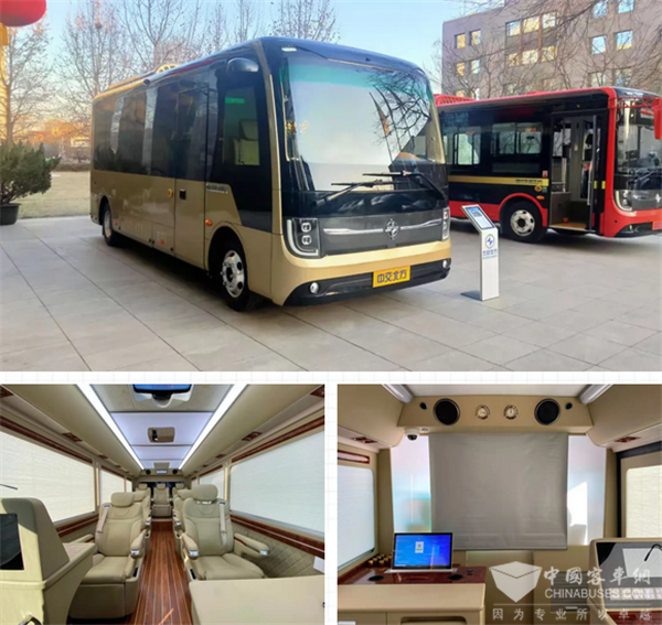 该产品是北京北方客车针对商务(公务)用车、VIP摆渡、精品旅游等市场匠心打造的一款精品客车。此次参展车型为高端公务用车,除了具有良好的驾乘体验外,还针对公务出行配置了局域及远程同步会议系统设施,分别设置了秘书台、首席会议台及9座商务会议座椅,可实现途中实时会议召开,文件审批等功能,极大提升了公务办公效率。同时兼顾乘员的乘坐舒适性与实用性,座椅采用180度可旋转加热功能,充分考虑会议模式及区域使用需求。车内配置空气净化器、电热水壶、雨伞、USB等多项人性化设施,为乘员旅途更添舒适。