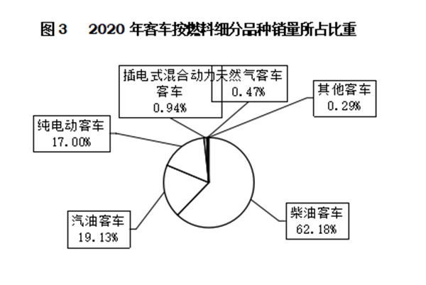 2020年,从按燃料细分品种销售情况来看,柴油客车总体表现好于上年,销量结束上年下降,呈小幅增长,共销售27.20万辆,同比增长5.43%,占客车销售总量的62.18%,比上年高出5.51个百分点;汽油客车则表现不如上年,结束快速增长呈明显下降,共销售8.37万辆,同比下降17.47%;天然气客车降幅也比上年有所扩大,共销售0.20万辆,同比下降39.67%,降幅比上年扩大23.74个百分点。新能源客车依然延续了上年下降趋势,共销售7.94万辆,同比下降13.87%。其中:纯电动客车销售7.44万辆,同比下降12.37%,降幅比上年扩大3.76个百分点;插电式混合动力客车销售0.41万辆,同比下降28.06%,降幅比上年扩大25.12个百分点。此外,燃料电池客车表现也不如上年,结束了连续两年快速增长,呈快速下降,共销售962辆,同比下降41.63%。