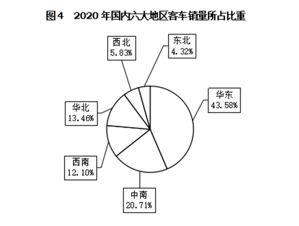 2020年,从国内六大地区客车销售情况来看(注2),与上年相比,华东地区销量增长最为明显,共销售15.26万辆,同比增长15.33%,增速高于上年13.72个百分点;华北地区结束上年下降呈小幅增长,共销售4.71万辆,同比增长6.87%;中南地区降幅有所收窄,共销售7.25万辆,同比下降11.06%,降幅比上年收窄6.03个百分点;西南和西北地区结束上年增长,有所下降,分别销售4.24万辆和2.04万辆,同比下降8.07%和11.28%。东北地区降幅比上年明显扩大,共销售1.51万辆,同比下降22.44%,降幅比上年扩大20.71个百分点。
