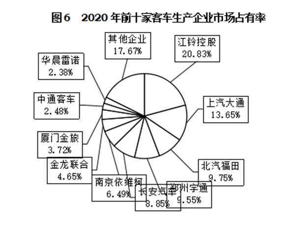 2020年,行业内骨干企业依然保持较高市场占有率,其中客车销量排名位居前十位的企业依次是:江铃股份、上汽大通、北汽福田、郑州宇通、长安汽车、南京依维柯、金龙联合、厦门金旅、中通客车和华晨雷诺,分别销售9.11万辆、5.97万辆、4.27万辆、4.18万辆、3.87万辆、2.84万辆、2.03万辆、1.63万辆、1.08万辆和1.04万辆。与上年相比,排名前三强企业市场表现较为突出,销量同比均呈较快增长,其中上汽大通增速尤为显著,南京依维柯增速也超过10%,其他六家企业均呈下降,华晨雷诺降幅更明显。2020年,上述十家企业共销售36.01万辆,占客车销售总量的82.33%。