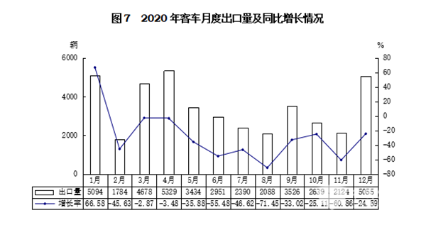 受海外疫情持续蔓延影响,客车出口总体较为低迷。2020年,客车累计出口4.11万辆,同比下降34.45%,降幅比上年扩大22.83个百分点;客车出口总量占销量的比重为9.40%,比上年下降4.37个百分点。从全年客车月度出口量同比增长变化情况来看,只有1月出口量呈快速增长,其他各月均呈下降,其中3月和4月降幅略低,其他各月降幅均超过20%。