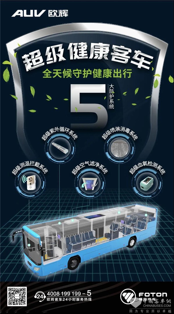 福田欧辉打造的“超级健康客车”解决方案,通过超级测温拦截系统、超级空气滤净系统、超级紫外循环系统、超级喷淋消毒系统和超级血氧检测系统五大健康防护利器,为客车车内空气净化、接触面消毒和乘客健康状态的实时防护,筑起了坚固的健康堡垒。