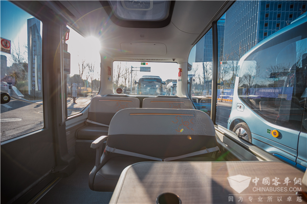 此次试乘的宇通驾驶微公交采用充满未来色彩的太空舱设计思路,将美学和科技完美融合,视觉识别性尤为突出;内饰设计以移动会客厅为设计理念,宽敞舒适的乘坐空间。侧面前后围三分之二为玻璃,具有超大的观景视野。车内配备的智能语音交互和导航系统,使用户可通过语音与车辆进行信息交流和常用功能控制,以用户为核心,引领设计趋势。