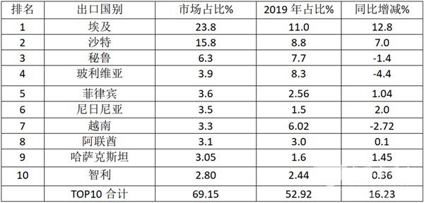 TOP10中,市场份额同比7增3降,其中份额同比增长最多的是埃及,增加了12.8个百分点,其次是沙特,份额同比增加7个百分点;份额同比减少最多的玻利维亚、其次是越南。