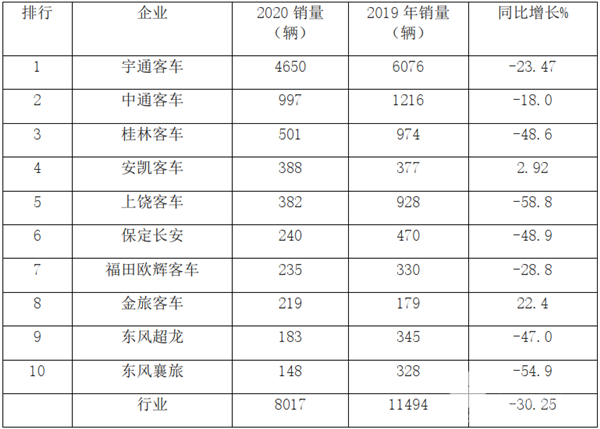 在2020年校车销量TOP10中:宇通客车销量4650辆,同比下降23.47%,一家独大,同比霸主地位凸显;中通客车销量997辆,同比下降18.1%,位居第二;桂林客车销量501辆,同比下降48.6%,位居第三。