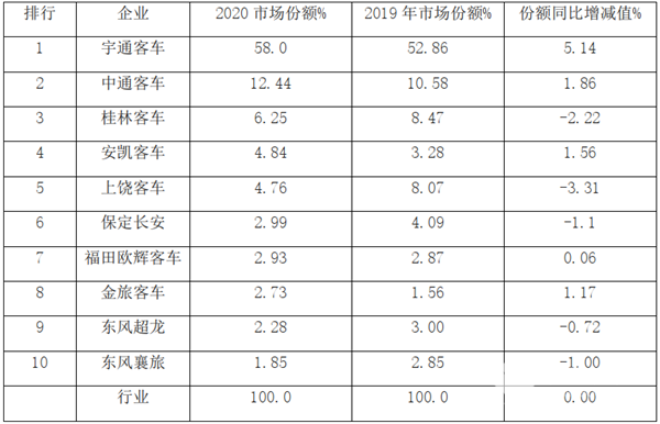 根据中国客车统计信息网数据,2020年校车TOP10占比及同比占比增减: