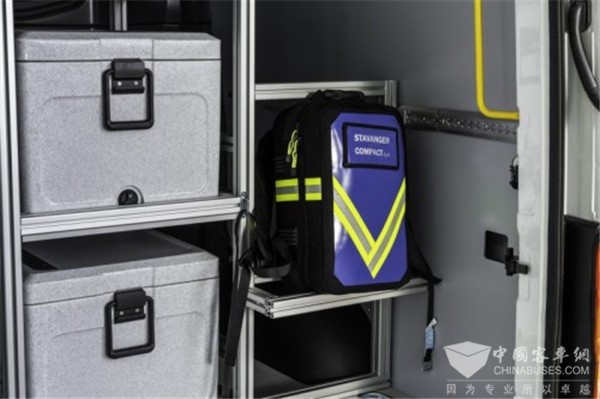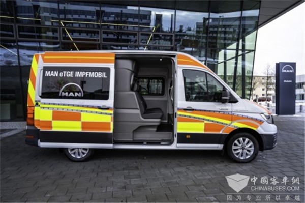 作为一款全电动厢式车,曼恩eTGE运行完全无排放,实际续航里程约120至140公里(按WLTP标准计,续航里程为115公里)。使用7.2千瓦交流充电桩,eTGE充满电量只需5小时。如使用最大功率40千瓦的直流充电站,仅需45分钟即可补充80%的电量。车内座位不仅能容纳6名出勤医护人员,车载设备还包括冷藏箱、应急设备、自动平移门、空调以及自动踏板。