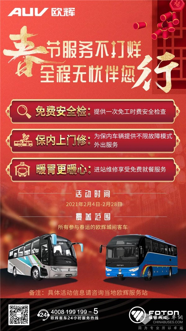 此外,福田欧辉回馈城间客车用户,凡是参与春运的车辆均提供一次免工时费安全检查;为保内车辆提供不限故障模式外出服务;春运期间进站维修享受免费就餐服务。
