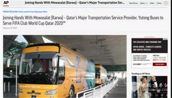 宇通服务此次世俱杯赛事活动,获得了包括英国、澳大利亚、新西兰、新加坡、沙特、卡塔尔、阿联酋、西班牙、保加利亚 、墨西哥、智利、哥伦比亚、阿根廷、法国、阿尔及利亚、埃及、南非、俄罗斯、乌克兰等40余个国家海外媒体传播,覆盖英语、法语、西语、阿语、俄语5大语种。彭博社、美联社等一些国际主流通讯社与主流经济观察类媒体以及沙特汽车网等150余个行业媒体和新闻网站汽车频道也对此事进行了报道。