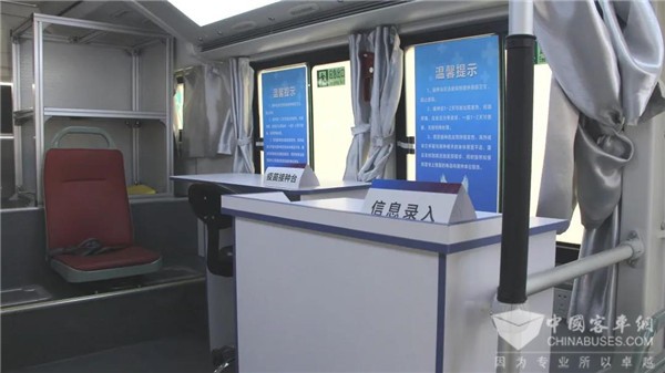 车厢也以后门为界限,分成了前后两个接种区域。在前面的接种区域,参照接种流程,先是在等候区的座椅上等待,接着就到信息登记台进行登记,然后就可以到疫苗接种台进行接种,接种完成后可在车外留观区留观。后方区域的设置与前方相同,但是二者之间专门有一道门帘。“门帘隔开后,后方区域就可以专门为女性接种,可以在接种过程中保护隐私。”北汽福田欧辉客车事业部产品总监程华介绍。