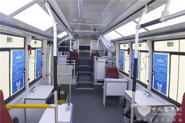 移动疫苗接种车依托现有BJ6105纯电动城市客车基础研制,与此前研发的全国首款移动核酸检测车为“姐妹车”,集安全性、健康性、机动性于一体,车内设置多个区域,涵盖接种人员前期等待、信息录入、疫苗接种、车外留观等一系列流程。