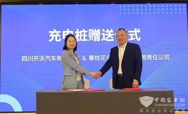在纯电动乘用车、卡车、专用车、环卫车、充电桩等领域,开沃集团还为攀枝花用户带来了诸多产品推介与经验分享,并赠送攀枝花公交公司5台“一拖十”400千瓦大功率充电桩,为公共交通电动化发展带来有力支撑。