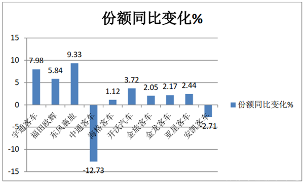 东风襄旅市场份额为9.33%,同比净增长9.33个百分点,表现也不俗;中通客车市场份额为7.17%,同比减少12.73个百分点;海格客车市场份额5.57%,同比增加1.12个百分点,表现不错;开沃汽车市场份额5.01%,同比增加3.72个百分点,表现较好;金旅客车市场份额4.95%,同比增加2.05个百分点,表现不错;金龙客车市场份额3.87%,同比增加2.17个百分点;表现较好;亚星客车市场份额2.66%,同比增加2.44个百分点;表现不错;安凯客车市场份额2.38%,同比减少2.71个百分点。