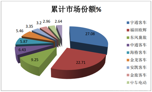 宇通客车累计销售4158辆,同比增长27%,市场份额为27.08%,稳居行业榜首;福田欧辉客车累计销量3478辆,同比增长115.38%,市场份额22.71%,位居第二。东风襄旅累计销量1421辆,属于净增长,市场份额为9.25%,排名第三;中通客车累计销量为974辆,市场份额为6.34%,位居第四;海格客车累计销量902辆,市场份额为5.87%,位居行业第五。