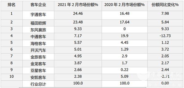 根据中国客车统计信息网数据,2021年2月TOP10市场份额及同比增减统计: