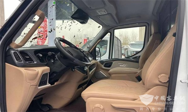 内饰豪华公务舱设计,以驾乘者为核心的触感、听觉、视觉三个方面的改进,侧重于提升用车体验。八项从上到下改进,360°豪华触感,从车顶内饰到地垫全面升级。值得一提的是,车门全新软包设计,扶手处新增个性化装饰,三向调节电加热座椅的按键集成在车门上,操控方便,驾乘舒适。全新气囊座椅,采用真皮包覆,装饰线针脚均匀一致,品质感再次提升。2021款国六进口依维柯底盘新增了电子调节功能,且靠背还可通风,夏天开车也相当舒适。方向盘同样进行了升级,由真皮和桃木高档装饰工艺包覆,更有握持感。中控和储物区也增加了真皮包覆,细密均匀的针脚凸显匠心工艺。遮光板麂皮全包,手感细腻,风格典雅,轻奢格调立显。A、B柱扬声器、车门扬声器都进行了全新的造型设计,更贴近豪华轿车质感。
