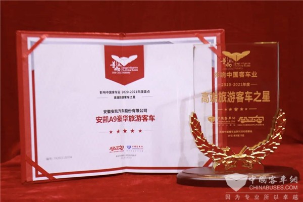 获评影响客车业“2020-2021年度高端旅游客车之星”的安凯A9豪华客车是面向高端客运、商务旅行、团体通勤等市场的高端车型。