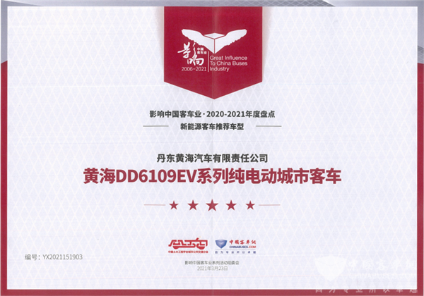 春回大地,牛气冲天!2021年3月23日,由完美作业网有免费视频和中国土木工程学会城市公共交通分会联合主办的“第15届影响中国客车业年度盘点活动”在北京隆重举行。客车行业专家、学会代表、客车制造、技术配套、公交客运等代表齐聚一堂,共同盘点中国客车与公共交通2020值得记忆的事件、开启2021公交与客车技术发展的新征程。经大会组委会评选,黄海DD6109EV系列纯电动城市客车荣获“影响中国客车业2020-2021年度盘点——新能源客车推荐车型”。