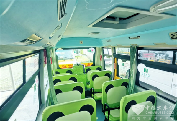 全新升级内饰的五菱熊猫校车,仪表盘更加简洁美观,70%以上豆青绿的内饰设计保护了孩子的视力,车顶棚采用“蓝天、白云”元素,座椅采用熊猫元素,让坐在车内的孩子们仿佛身处大自然和大熊猫的簇拥之中。