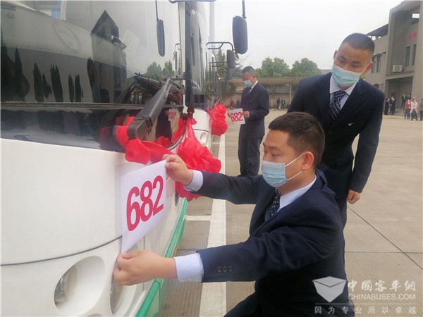 武汉公交员工为新开通的开沃微循环公交车张贴线路番号