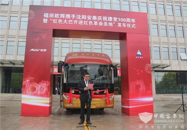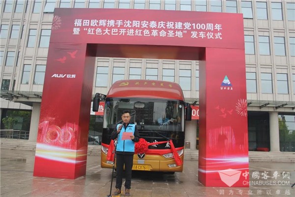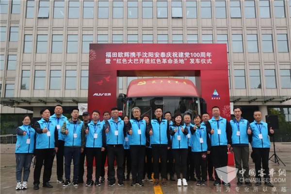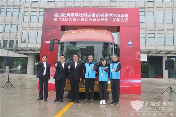 2021年4月22日,福田欧辉携手沈阳安泰庆祝建党100周年暨“红色大巴开进红色革命圣地”活动正式发车。“红色大巴”将先后到访香山革命纪念馆、西柏坡纪念馆、北戴河等革命地标,重温中国共产党光辉的发展历程,全面激发“不忘初心、牢记使命”的创业激情。沈阳安泰旅游汽车有限责任公司董事长王卓,福田汽车集团业务副总裁、欧辉客车事业部党委书记、总裁梁兆文以及福田欧辉和沈阳安泰优秀党员代表及媒体等30余人出席发车仪式。