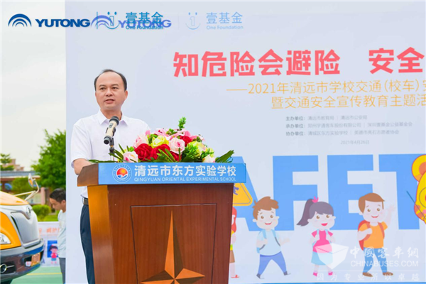 道路交通迅速发展,人们日常出行越来越便捷,很大程度方便了我们的生活。但是快节奏的生活,却让很多成年人忽略了孩子们的交通安全意识,因此更多的小朋友正受到越来越大的威胁。刘耀坚呼吁到:“同志们,学生的交通安全关系着家庭的幸福和社会的稳定,需要学校、家庭、社会携手共同努力,希望全社会都来关心学生安全教育。一直以来,清远市政府高度重视校园安全管理,积极探索新时代德育引领校园综合发展新模式,推动教育改革创新发展。今天在清城区东方实验学校举办‘宇通壹基金交通安全公益行’活动,为学校师生们提供了一种以寓教于乐的形式,让大家接受一次全新体验的教育模式。相信广大师生感受到了文明出行的重要。希望有更多像壹基金和宇通客车股份有限公司这样的社会组织与爱心企业,参与校园交通安全教育。”
