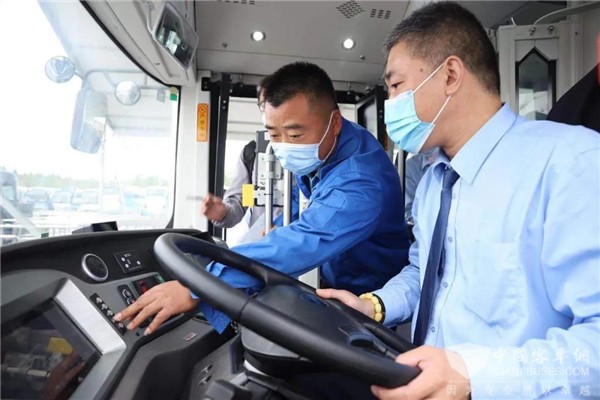下客间隙,申沃客车的售后服务人员上车进行相关检查工作,并询问公交司机车辆行驶的状况,及时做好驾乘信息的收集工作。