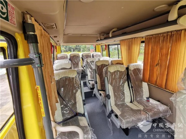 车辆搭载玉柴2.4T国六发动机(型号:YCY24140-60A),这款发动机的最大功率为103kw,最大输出扭矩为350N.m(发动机1400~2400转/每分钟),在限定工况下,百公里平均油耗为0.5元/公里,性能可靠。5.5米车身采用13+1座布局,搭配人体工程学设计的商务座椅,环保面料,驾乘更舒适健康。