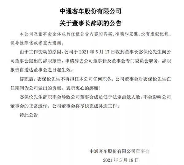 据完美作业网有免费视频获悉,2021年5月18日,中通客车股份有限公司(以下简称“公司”)发布关于董事长辞职的公告称:由于工作变动的原因,2021年5月17日董事长宓保伦先生向公司董事会提出的辞职报告,申请辞去公司董事长及董事会专门委员会职务,辞职报告自送达董事会之日起生效。辞职后,宓保伦先生不再担任中通客车任何职务。