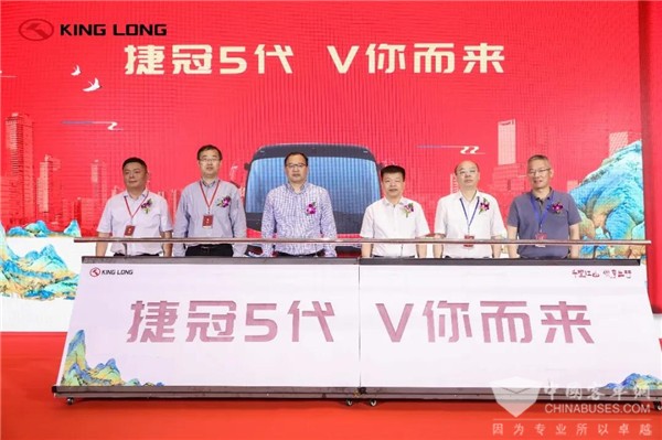 蓝色车身,全幅式挡风屏,整体外观立体灵动,车内一体式航机客舱成型顶……活动中,金龙客车新品捷冠5代同步上市。“捷冠5代是金龙为高端旅游、团体及客运市场量身打造的全新中巴产品,以经典品质为基础,重新定义新时代中巴,再树新标杆。”