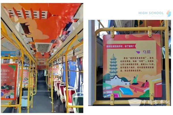走进车厢,车顶是卡通图案绘制的福州古厝群,车厢两侧的拉扶手环形成了一页页生动有趣的“福州历史文化知识阅读卡”,手环上印着简单有趣的历史文化名人小知识。上下车挡板和16个座椅椅背则以卡通图文的形式打造成了“阅读小报”,分别印制了“乌塔”、“白塔”、“三坊七巷”、“上下杭历史文化街区”、“镇海楼”等福州古建筑历史知识。该主题公交线路在六一儿童节来临之际,为儿童打造了一个“流动的图书馆”,让孩子们在乘车过程中随时享受到阅读的乐趣。