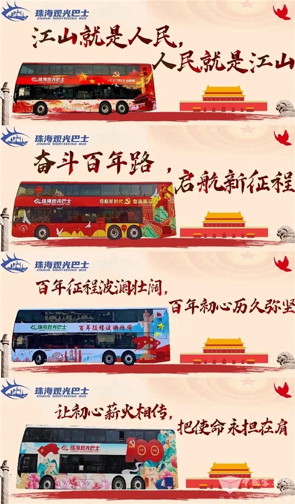 为迎接建党100周年,打造沉浸式、立体化党史学习教育阵地,珠海公交观光旅游公司打造“红船精神号”、“奋进百年号”、“大好河山号”、“光辉历程号”等独具特色的党建主题银隆新能源双层观光巴士。