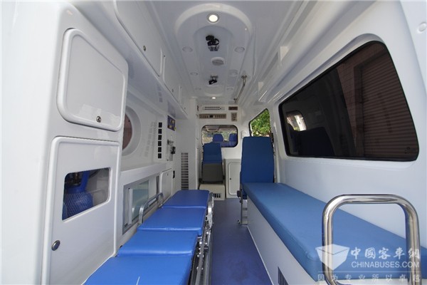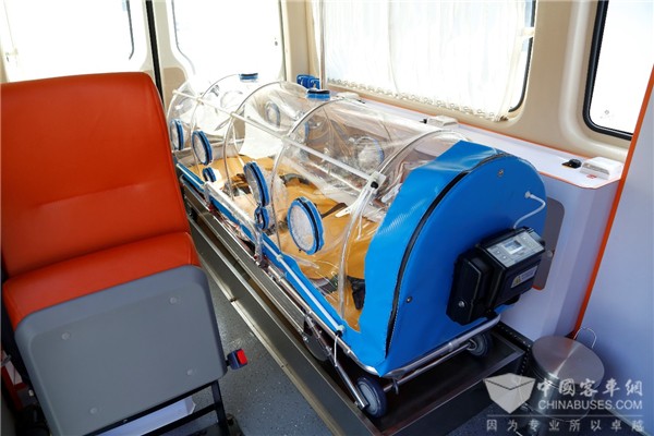 金旅领特负压救护车首先具备普通救护车的基本功能。医疗舱内部尺寸为3250mm×1790mm×1900mm(长/宽/高),配备救护担架、氧气瓶、排气扇、消毒灯、对讲机等急救设备。可以针对不同医院和机构的具体需求,车辆加装例如除颤仪,呼吸机,心电监护等全套抢救设备,为救援开启“加速度”,为患者的抢救争分夺秒。